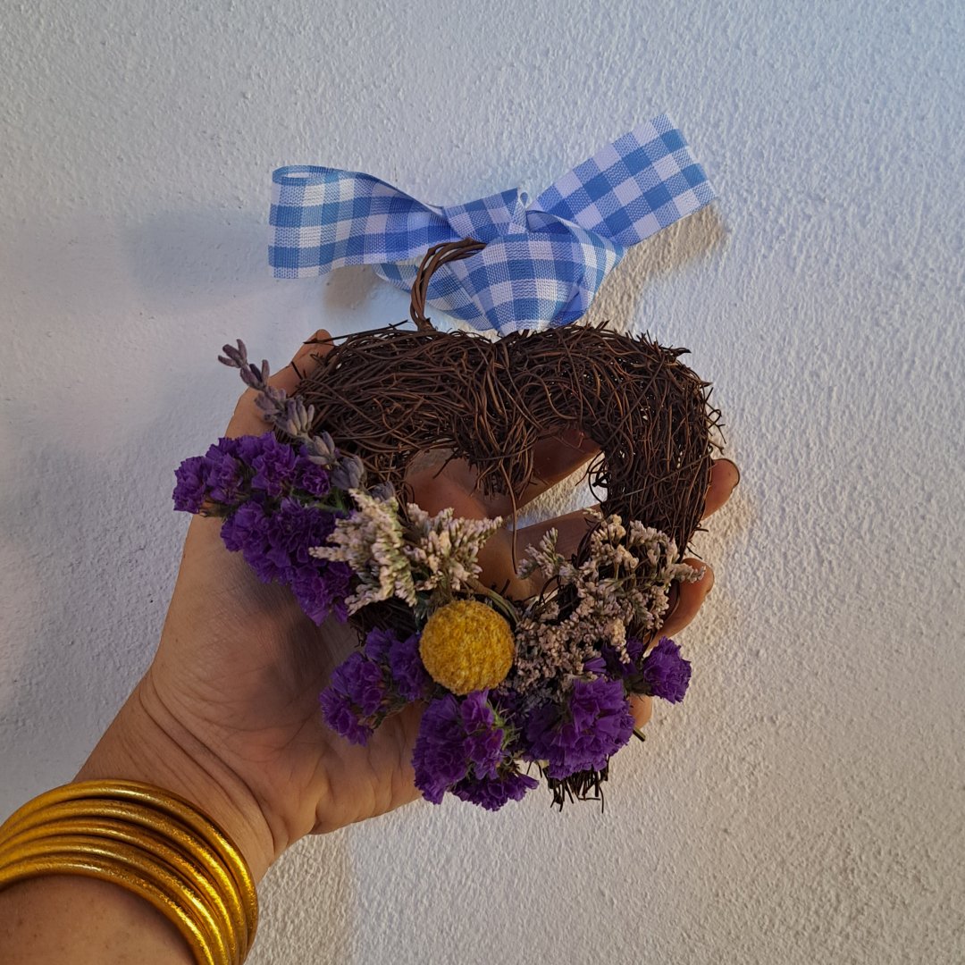 Corazones de mimbre de aproximadamente 8 cm de ancho decorados con flores y plantas de nuestra granja que secan bien y con lazo de tela para que puedas colgarlo donde desees; en la manecilla de una puerta, en la pared, en el cabecero de la cama… ideales para hacer más acogedor el rincón que desees.