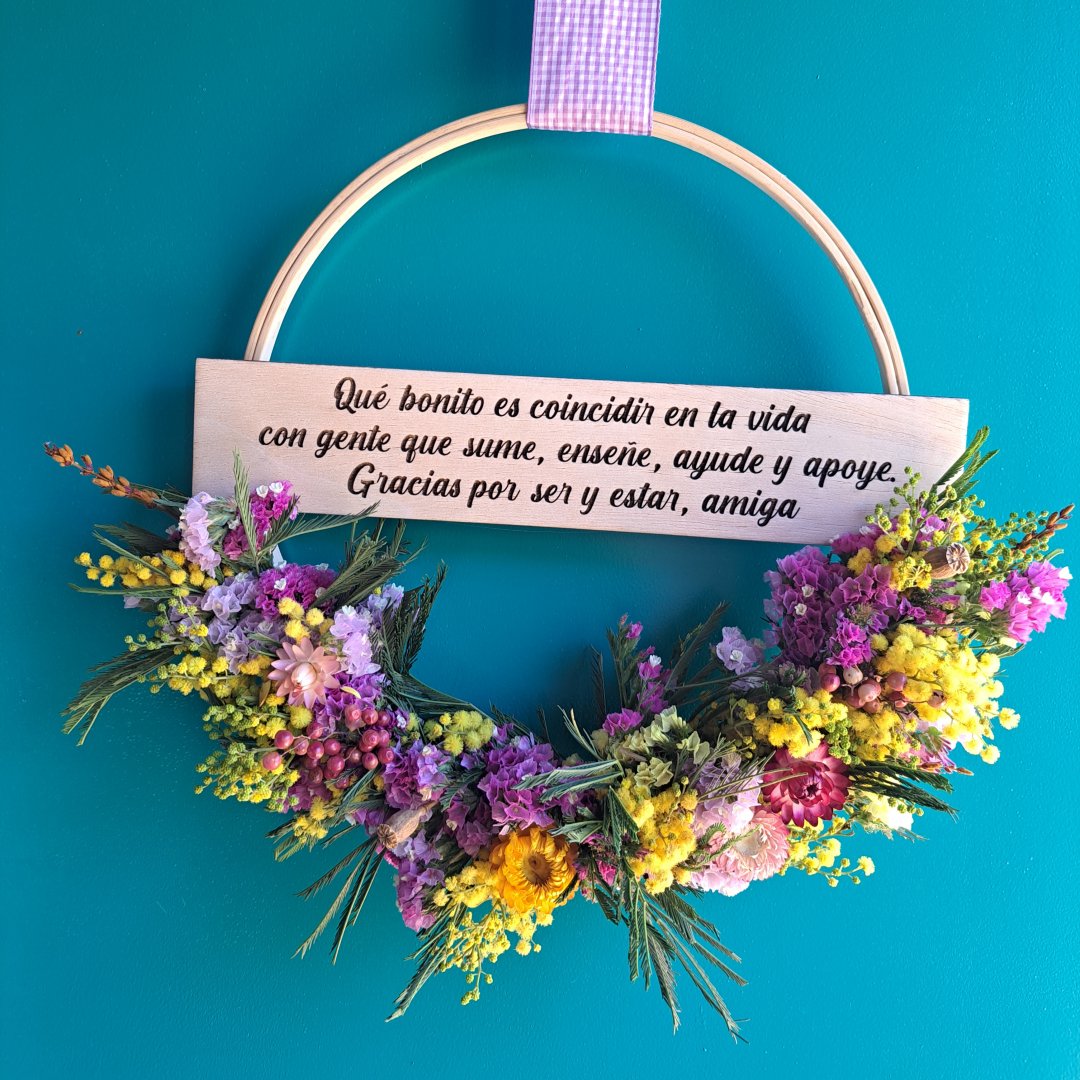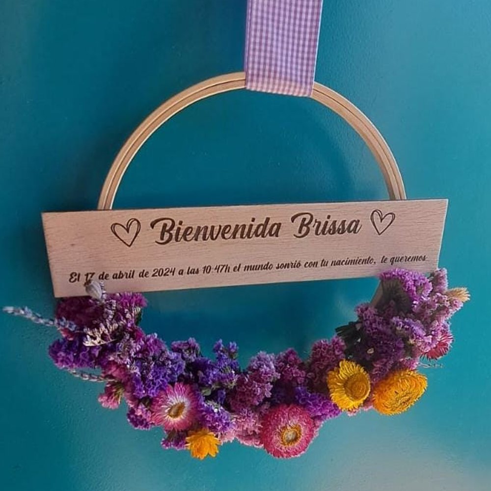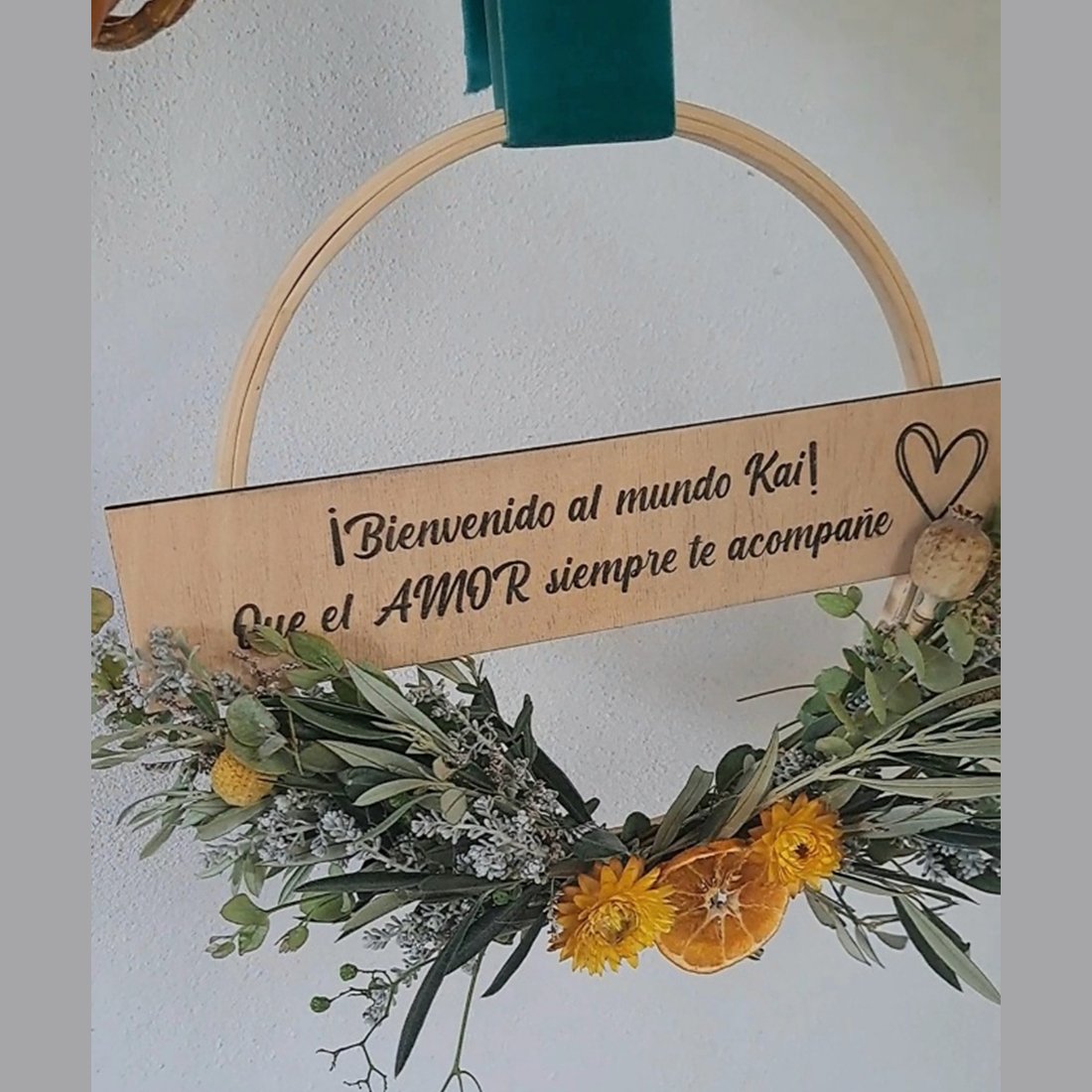 Coronas de madera realizadas de manera artesanal y personalizadas con el nombre o la palabra que desees sobre una tablita de madera, decoradas con flores y plantas naturales de temporada que secan bien y comparten su aroma.