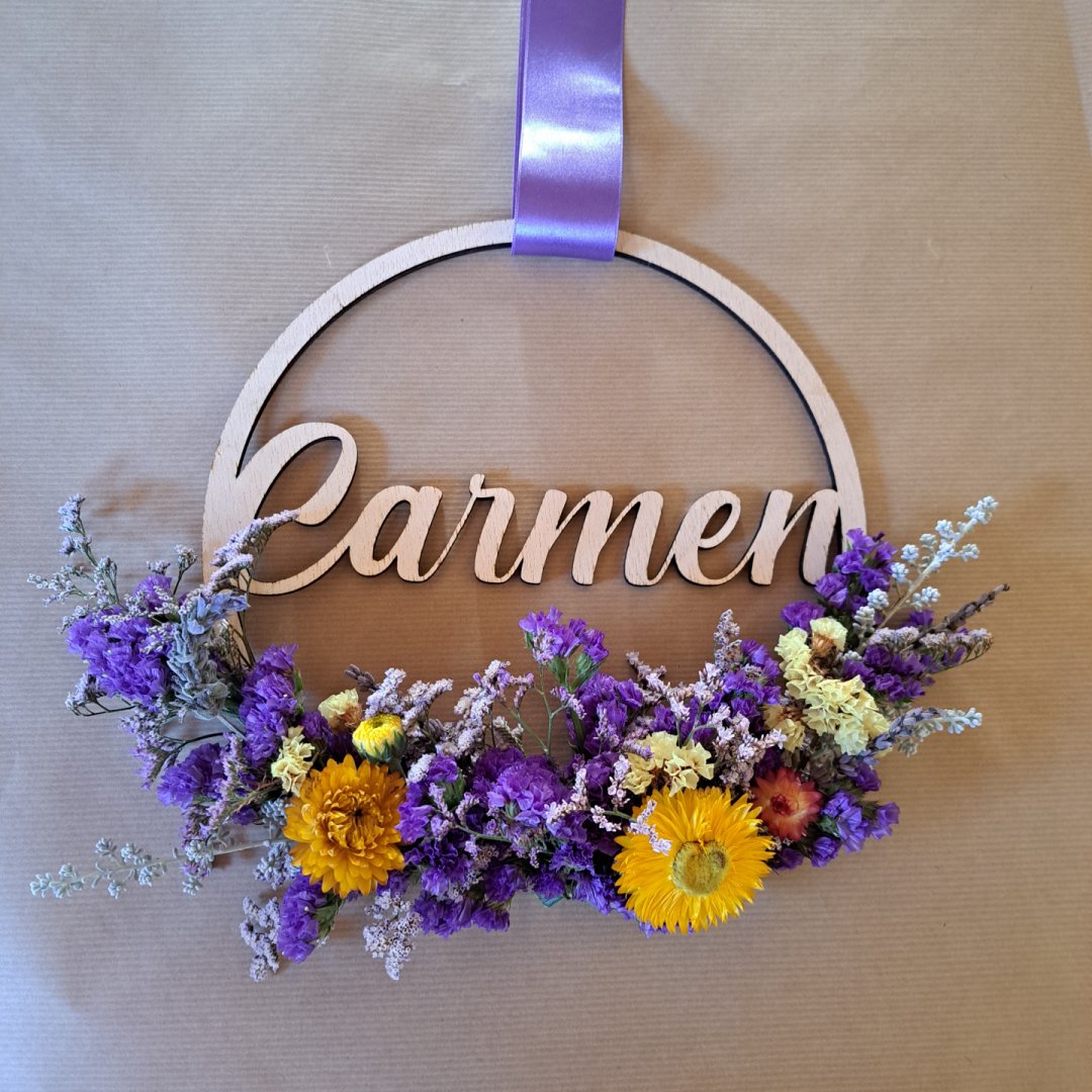Nuestras coronas de madera  son realizadas de manera artesanal y personalizadas con el nombre o la palabra que desees, decoradas con flores y plantas naturales de nuestra granja que secan bien y comparten su aroma.